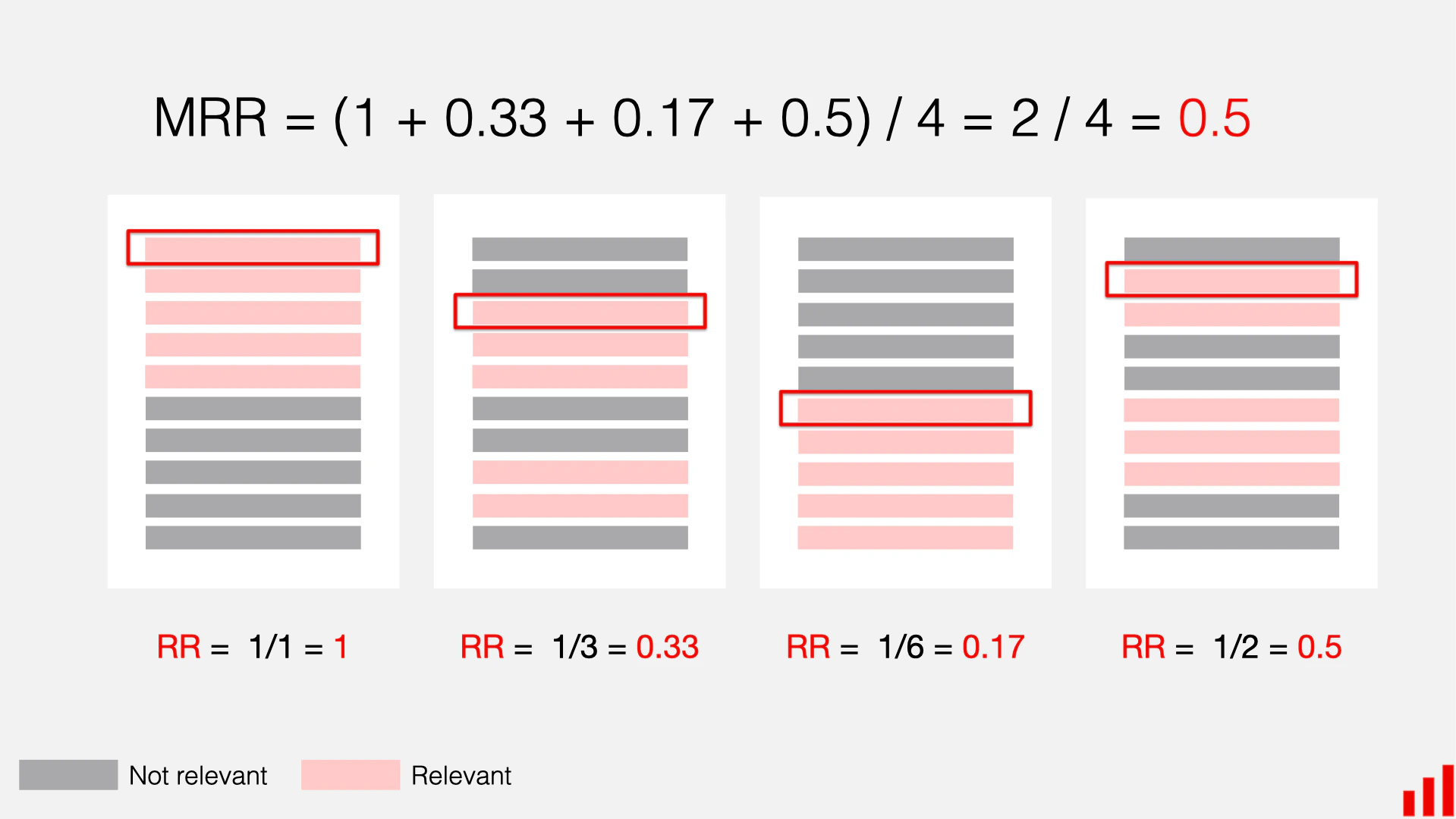 Pongo calculates accuracy on your top 5 search results using Mean Reciprocal Rank (MRR). This metric takes into account the rank of the first instance of a relevant result, where all relevant results at rank 1 is a perfect score and no relevant results is 0. This graphic from Evidently AI explains it best: